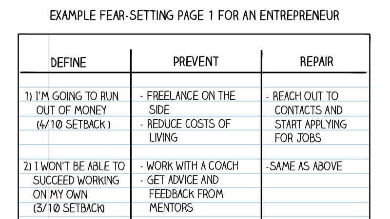 For example, I mapped out my fears of leaving my job to travel. Not getting another job, being homeless, public failure. I then listed ways to recover.