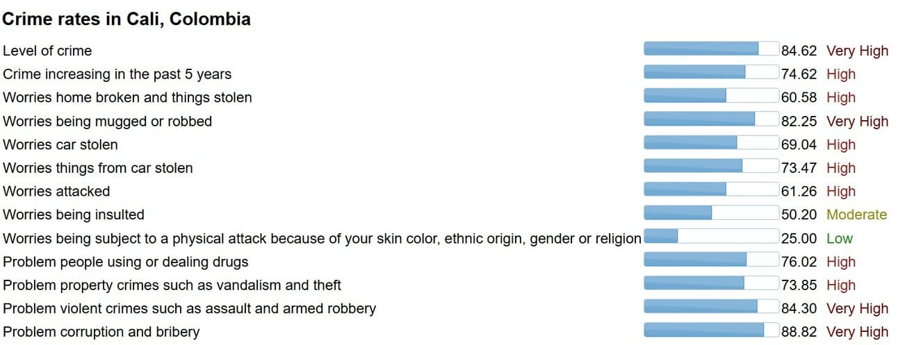 Shit, not even Bogota’s sketchy ass received a “very high” rating in any area. Cali’s got 4. At least you won’t get attacked based on your skin color—thass luv 🤝